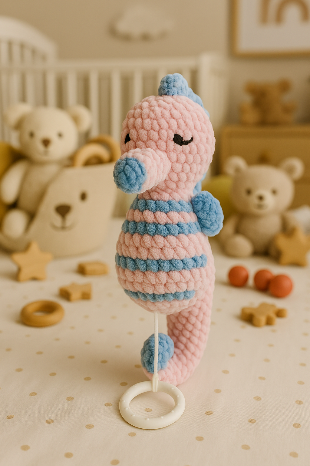 "Coral Sky"- Dein gehäkeltes Seepferdchen mit Spieluhr. Liebevoll aus weicher Wolle gehäkelt, bringt "Coral Sky" sanften, maritimen Charme ins Babyzimmer. Die integrierte Spieluhr spielt beruhigt "Schlaf, Kindlein, Schlaf" und begleitet kleine Träumer behutsam in den Schlaf - ein niedlicher Begleiter und zauberhaftes Deko-Highlight zugleich.