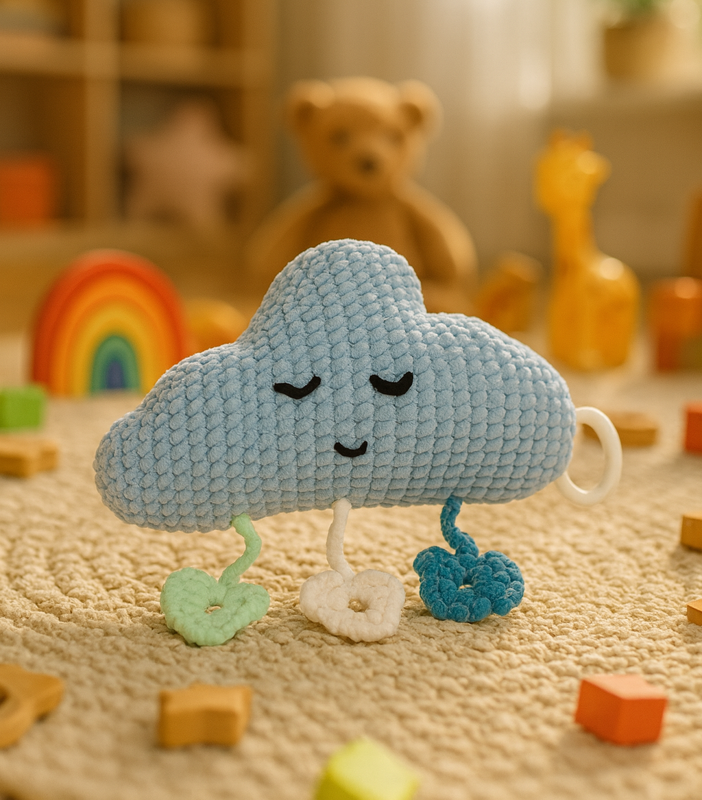 "Luna Cloud" - gehäkelte Wolken - Spieluhr. Zart wie eine Sommerwolke schwebt "Luna Cloud" ins Kinderzimmer. Liebevoll aus weicher Wolle gehäkelt, bringt sie mit ihren kleinen Herz-Tropfen sanften Charme und Geborgenheit. Die integrierte Spieluhr spielt beruhigend "Schlaf, Kindlein, Schlaf" und begleitet kleine Träumer behutsam ins Land der Träume - ein himmlischer Freund und zauberhaftes Deko - Highlight zugleich.