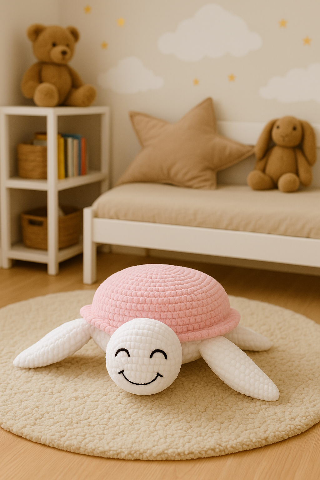 Handgemachte Schildkröte mit viel Liebe gehäkelt - weich, verspielt und perfekt für kleine Kinderhände. Mit pastellrosa Panzer, freundlichem Gesicht und flauschigem Körper ist sie ideal als Geschenk zur Geburt, Taufe oder zum Liebhaben.